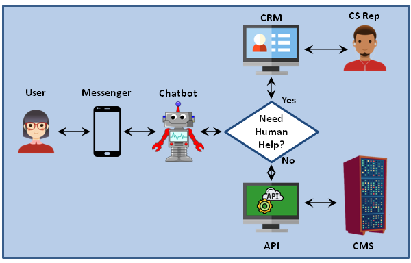 Think of a chatbot as a person, chatting away with your customers. It sits at the front-end of your customer service system, between the user and the rest of the system.