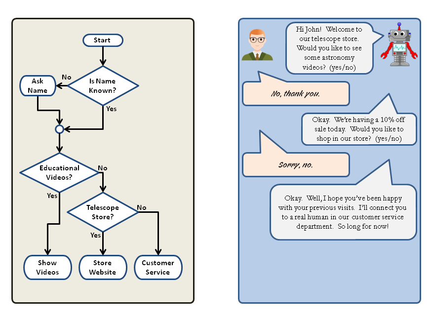 Today’s rule-based chatbots use a conversation-tree, which is a kind of flowchart. It has branch points where user input breaks the conversation into separate paths.