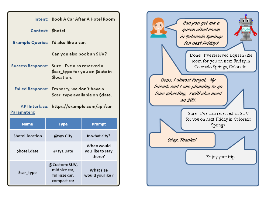 In this second request, the chatbot weaves through a long, complicated query, and determines that “need an SUV” is a match for the “Book A Car After A Hotel Room” intent. It also realizes that “SUV” is an appropriate value for the $car_type entity.