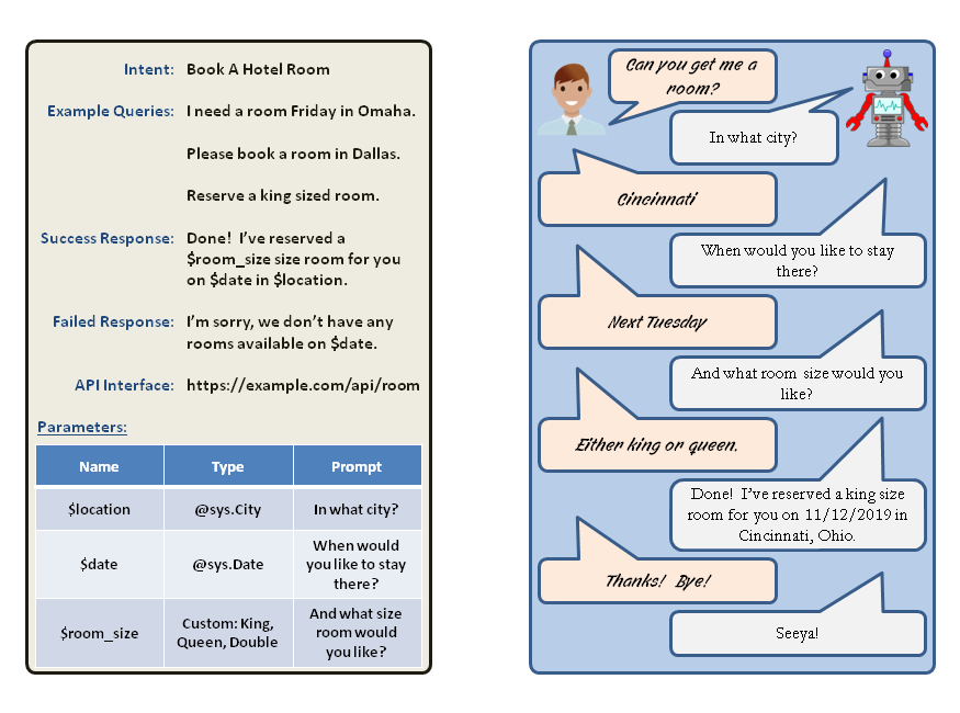 The chatbot then realizes that it needs values for the $location, $date, and $room_size parameters. We call these parameters “entities”.